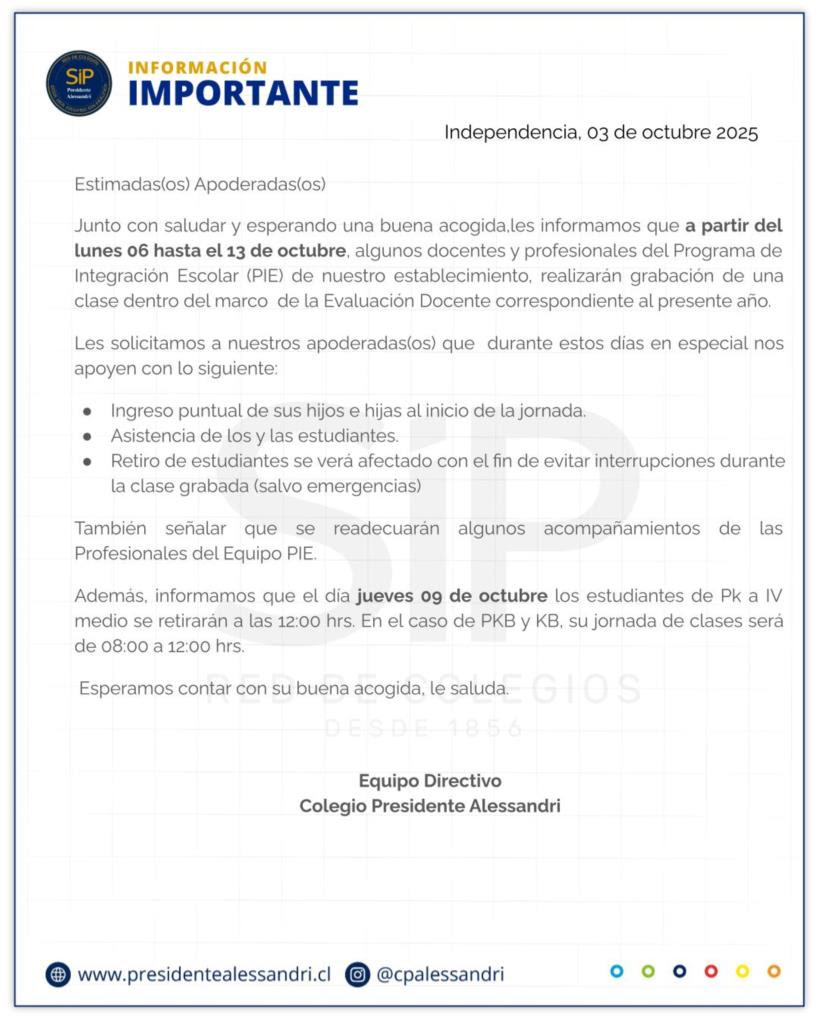 Junto con saludar, compartimos la siguiente información sobre grabación de clases en el Marco de carrera Docente , y horario de clases jueves 09 de octubre.